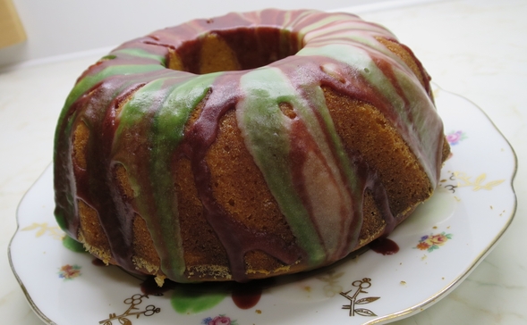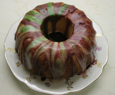 Ještě jsem si trochu upravila recept, protože mi v lednici zbylo trochu tvarohu s pudinkem, takže putoval do těsta. Doufala jsem, že nebude moc těžký a bábovku mi nesrazí. Naštěstí do bylo v pohodě. No a dál se mi tu válel zbytek zelené a hnědé citronové polevy. Na citronovou bábovku ideální. Udělala jsem ještě trochu bílé, nalila je do sebe a pomalu nechala stékat na bábovku. Vzniklo krásné mramorování alá mirror glaze.
