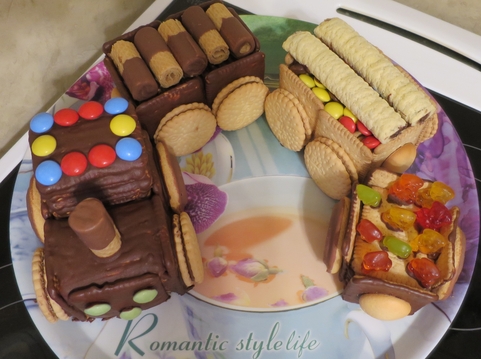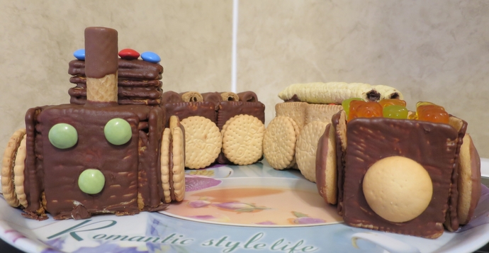 A myslím, že pokus vyšel velice dobře. Lokomotiva i vagóny jsou slepené tvarohovým krémem, který do druhého dne sušenky krásně zvláčněl. Kolečka jsou z Disco sušenek a zbytek zdobení je jasný z obrázku. Sestavení je celkem jednoduché a výsledek efektní. Synovo nadšení bylo velké a největší úspěch slavili gumoví medvídci, které z toho oďoubal jako první:-)
